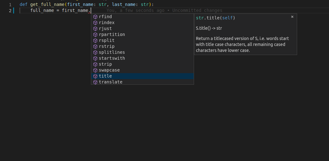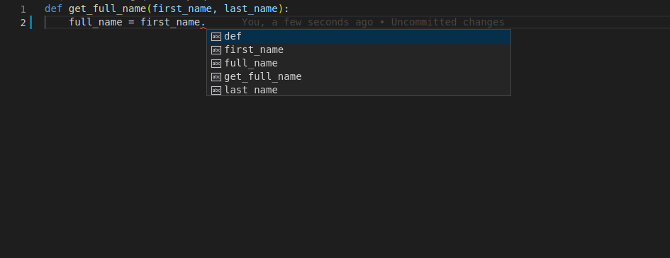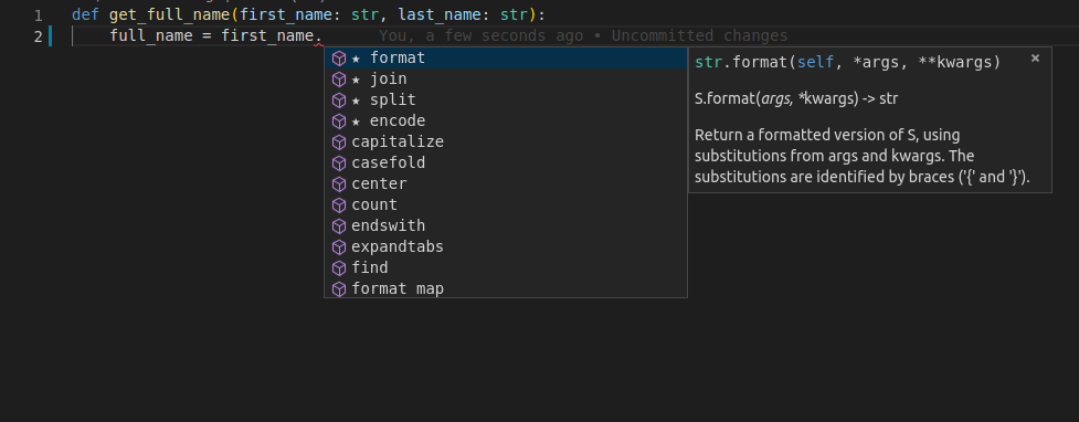 You type the first parameter of the function, first_name, then a dot (.) and then hit Ctrl+Space to trigger the completion.